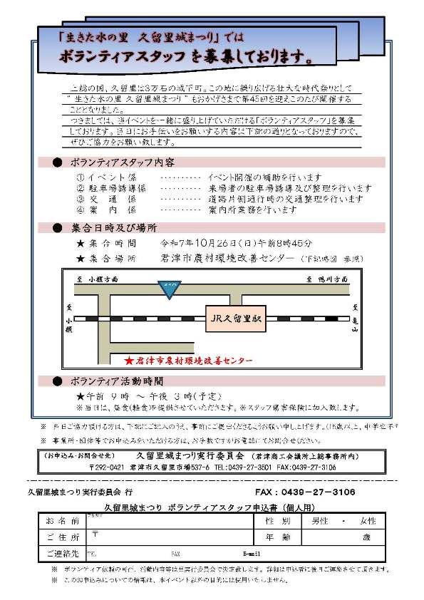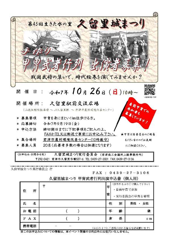 | 開 催 日:令和7年10月26日(日) 10時~ 開催場所:君津市久留里駅前交流広場 山徳旅館前駐車場 ⇓ JR久留里駅 ⇓ 君津市農村環境改善センター 集合場所:君津市農村環境改善センター(10:00厳守) 募集要項:甲冑(紙製)を身にまとい1Km 程度歩ける方 応募締切:令和7年9月19日㈮ 募集人員:20名(応募者多数の場合は抽選) 申込方法:住所・氏名・年齢・電話番号・FAX番号 身長・性別を記入してFAXもしくは郵送で お申し込みください。 (お寄せいただいた情報は甲冑武者行列 以外には使用いたしません。) ※甲冑武者行列出演申込書(個人用)PDF印刷用 お申込み・お問合せ 久留里城まつり実行委員会 TEL 0439-27-3501 FAX 0439-27-3106 〒292-04213君津市久留里市場537-6 (君津商工会議所上総事務所内) 久留里城まつり実行委員会 |